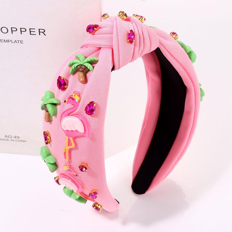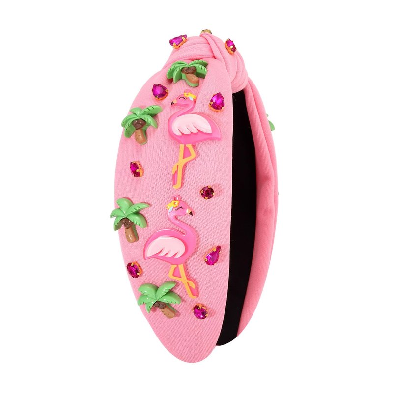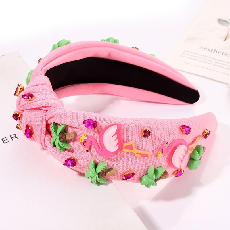 Features classic white top knot headband accent with pink flamingos and palm trees, and shimmering crystal gemstone embellishments.