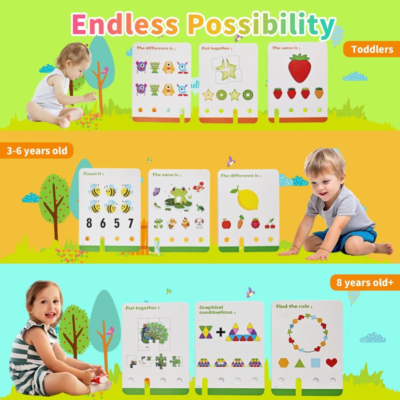 - 【Different Levels】 This toddler toy is divided into Level 1 (suitable for 3-6 years old) and Level 2 (suitable for 7-12 years old). Level 1 includes 9 ways to play: find differences/ find similarities/ find patterns/ find lines/ puzzles/ color correspondence/ color matching/ counting/ observing who is inside. This level adds 6 ways to play on the basis of Level 1: find symmetry/ food distribution/ fruit matching/ get out of the maze/ mirror figure/ geometric split.