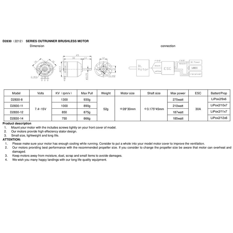 - Packing content:D2830-1300kv motor, 4pcs* M3*6MM Flat Wafer Head Screw, 1pcs* 3.17 mm Aluminum Bullet Propeller Adapter