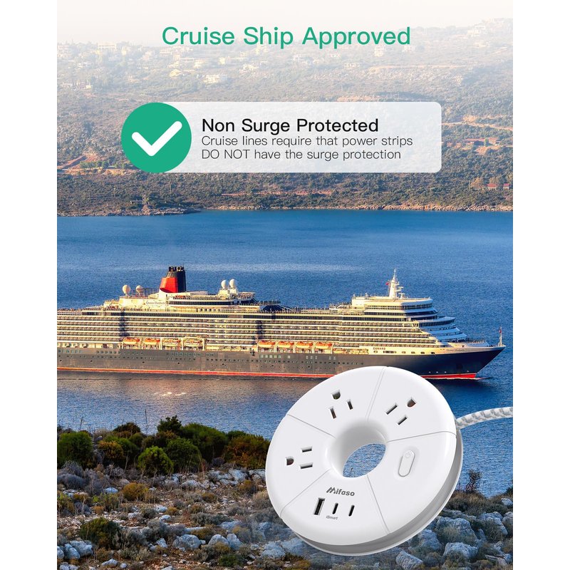 - 【Non Surge Protector for Cruise Ship】Cruise lines require that power strips DO NOT have Surge Protection. Surge protection may cause safety risks. This travel power strip was made specifically to adhere to this rule so it is compliant with the cruise ship regulations