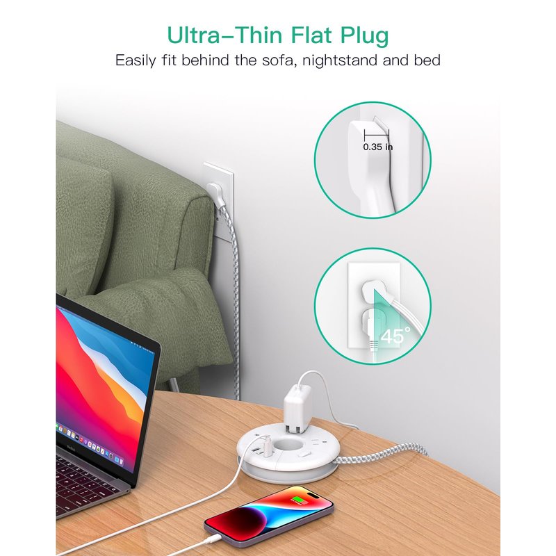 - 【0.35" Ultra-thin Flat Plug, Flat Braided Extension Cord】The flat plug is perfect to fit behind furniture such as sofa, bed, nightstand, TV cabinet. 45° right-angled design maximum saves the space and will not block other outlets. The flat extension cord can be easily hidden under the carpet to make your room tidier