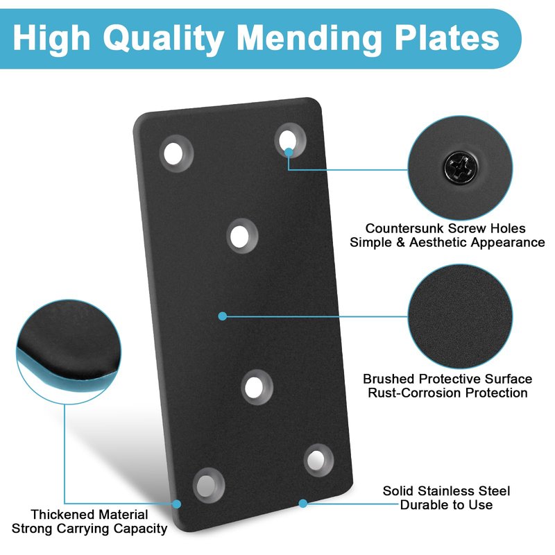 - Heavy Duty Black Mending Plate : This package includes 4Peices of flat mending plates made from high-quality stainless steel with a black powder coating, ensuring strong load-bearing capacity and excellent rust resistance. The durable, rust-proof design features a smooth surface and burr-free edges, making it perfect for repairing wooden furniture or fences, or providing additional support.