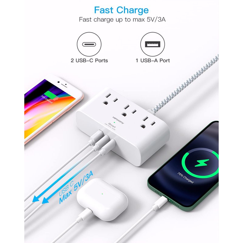 - 【2 x USB C Power Strip】- Added extra 2 USB C ports for your devices, the USB C port can charge up to 5V/3A. USB-A ports can charge up to 5V/2.4A Max, all USB Ports Output is 5V/3.1A, 15.5W max which is 30% faster than other power strip. With smart charging technology, it can auto-detects your devices and can reach faster charging efficiency, perfectly fit for your iphone, ipad etc