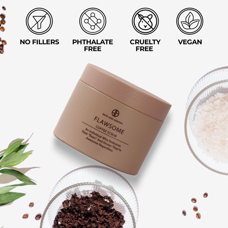 Flawsome 100% Natural Organic Arabica Ground Coffee Cellulite Reducing Body Scrub by Skin and Senses (11.5oz) — With Vitamin E, Carrot Seed Oil, and Coconut Oil