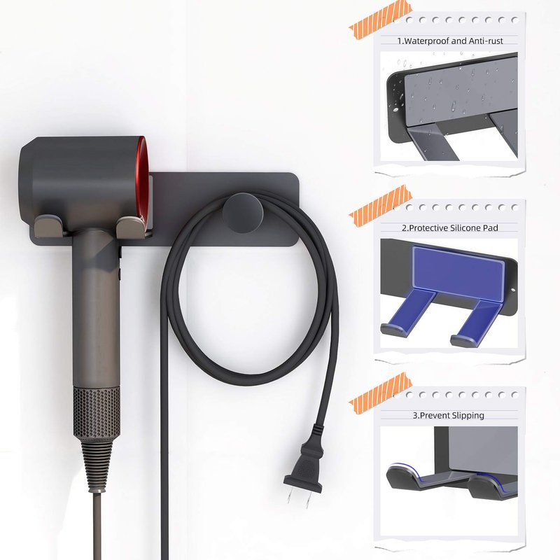 - 😘 Perfect Design - The hair dryer wall mount holder is perfect for your dyson hair dryer and its accessories. The Silicone pad on the hair dryer bracket can prevent the hair dryer from being damaged. Raised iron on both sides prevents the blower from slipping. (Dyson hair dryer and all accessories are not included)