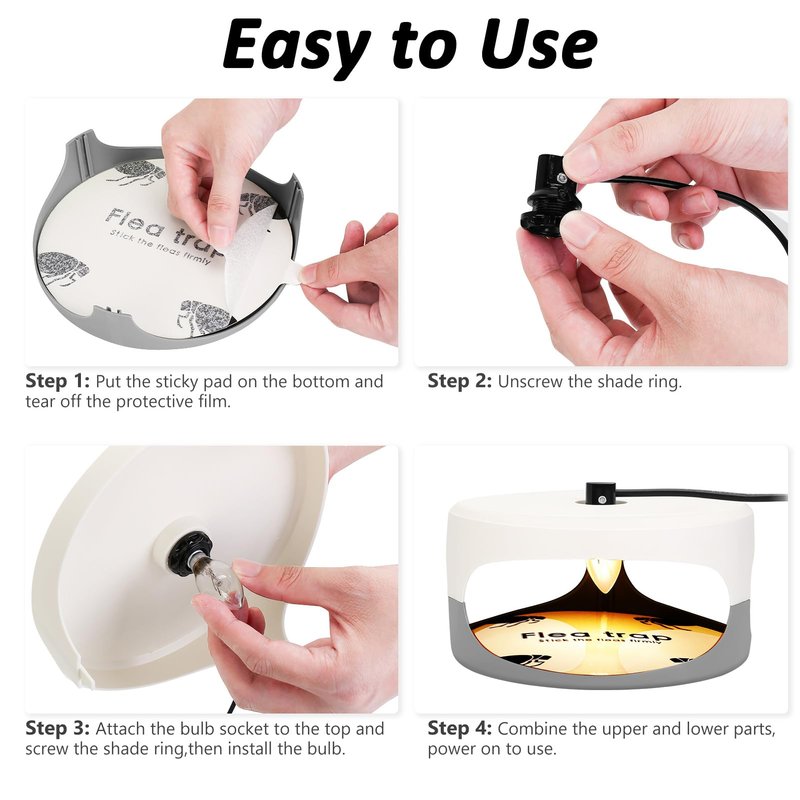 - Easy to Use: Simply insert a glue-board and install a bulb, then the flea trap is ready for insects catching when it plugs into any standard household outlet. Remove the sticky board when it is full of flies, replace it with a new one