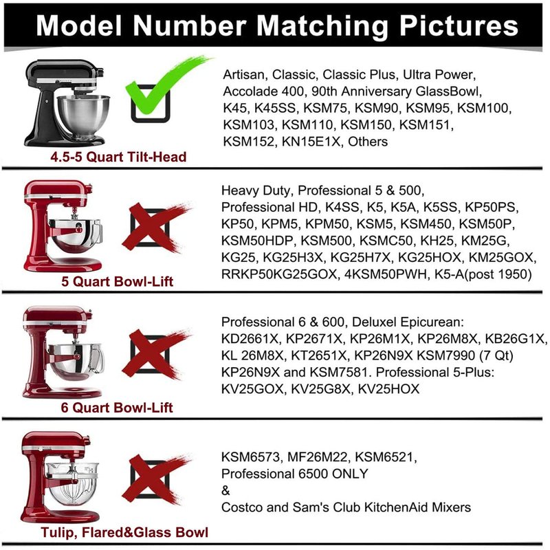 - [Compatibility] For kitchenaid paddle attachment works with 4.5-5 quart tilt-head stand mixer bowls, fit models: K45, K45SS, KSM75, KSM90, KSM95, KSM100, KSM103, KSM110, KSM150, KSM151, KSM152 (Not Fit 5 QT Bowl-Lift Mixers)