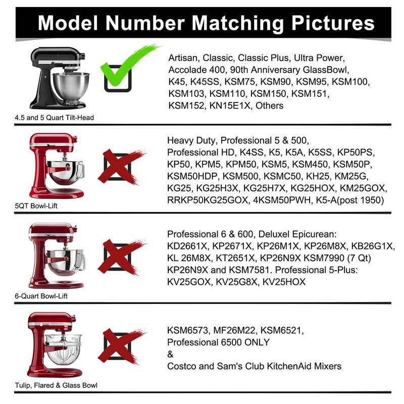 - Compatible with: Works with 4.5-5 quart tilt-head stand mixer bowls , fit modles: K45, K45SS, KSM1, KSM100, KSM110, KSM120, KSM15, KSM16, KSM75, KSM8, KSM90, KSM105GBCER (Not Fit 5 QT Bowl-Lift Mixers)