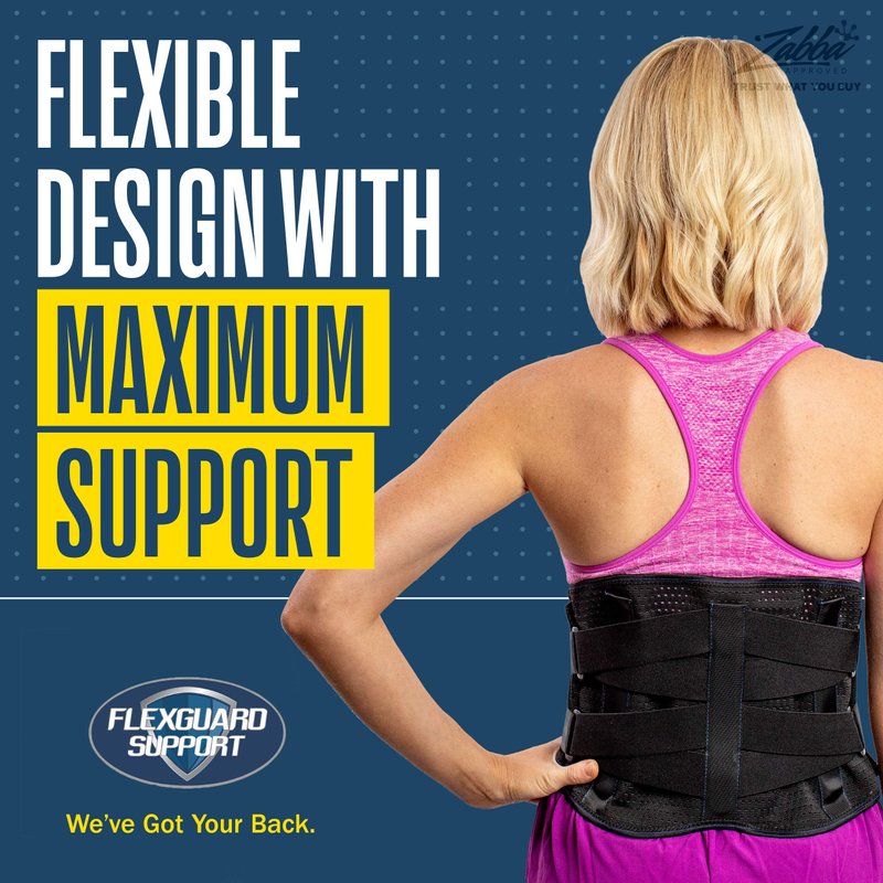 - Back support - FlexGuard support back brace for men and women works by reinforcing the spine and surrounding muscles when experiencing lower back discomfort. Help for sore joints, herniated discs