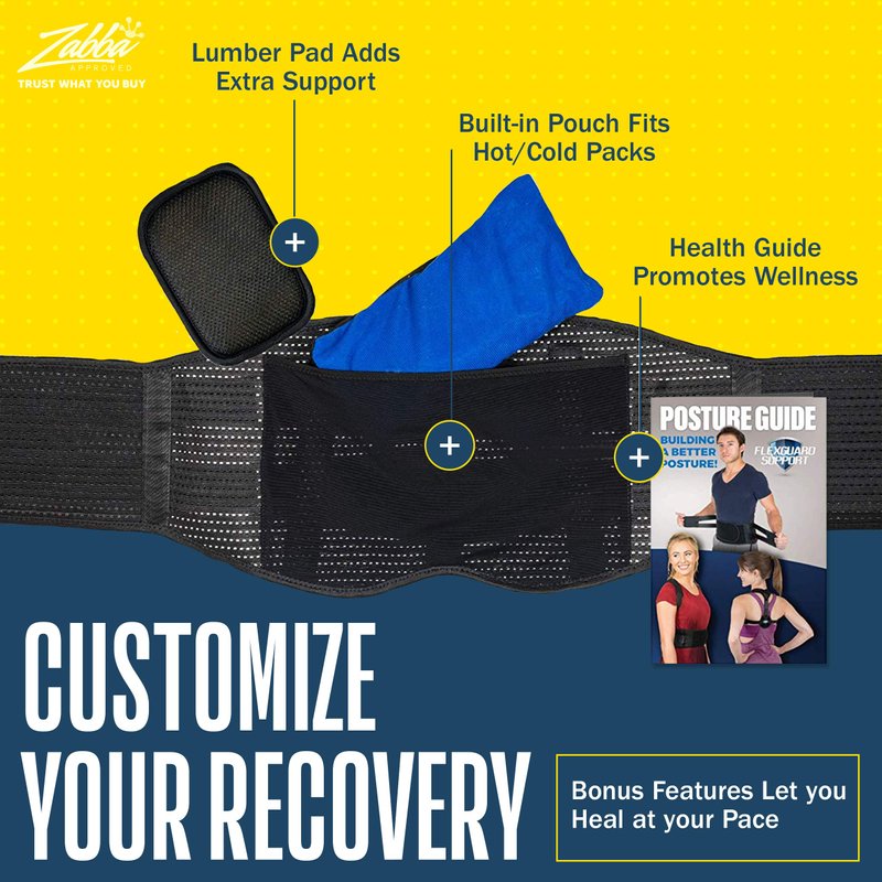 - Functional Pocket - Designed with the built-in mesh pockets to insert hot or cold packs (packs not included). Unique to FlexGuard, you can now enjoy temperature activated lower back brace support.