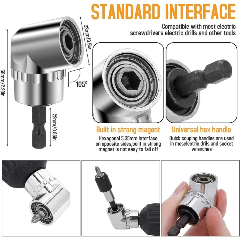 - 🔧【105° Right Angle Drill Attachment】It comes with a 105° right angle drill bit, suitable for drill bits, cordless drills or hand wrenches and screwdriver chucks. Made of high-quality aircraft carrier steel raw materials, fast, high-hardness angle steel drill frame, quick replacement, rust-proof. Specially designed for computer cases, electrical cabinets and other screwdrivers that work in tight spaces.