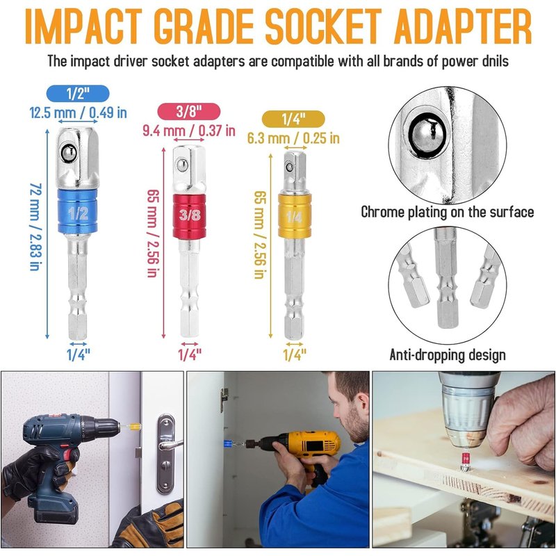 - 🔧【Universal Socket Adapter】3pcs 1/4", 3/8", 1/2" each with 1/4" hex drill bit for all quick change chuck adapter systems: power tools/drilling tools / Hand tools etc. Multi-purpose nut driver kit, spring loaded ball bearing lock on socket kit.
