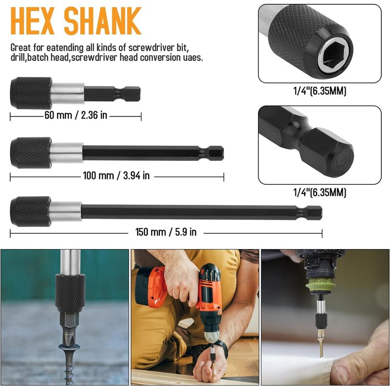 - 🔧【3Pcs Screwdriver Bit Holders】1/4 Inch Hex Shank Magnetic Extension Collet Adapter Quick Release Rod Sleeve Screwdriver Bit Holder | 60mm/ 100mm/ 150mm length, suitable for screwdriver bits for electric, pneumatic screwdrivers and other power tools, with extended drill bits.