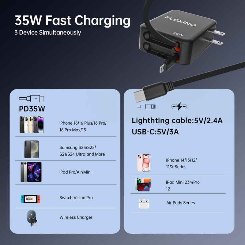 - Space-Saving Retractable Design: The FLEXINO retractable wall charger features dual 2.6ft retractable charging cables (USB C and Lightning), providing a clutter-free, compact charging solution. Ideal for any workspace, travel bag, or home setup, this retractable charger wall plug keeps your space organized and cable-free