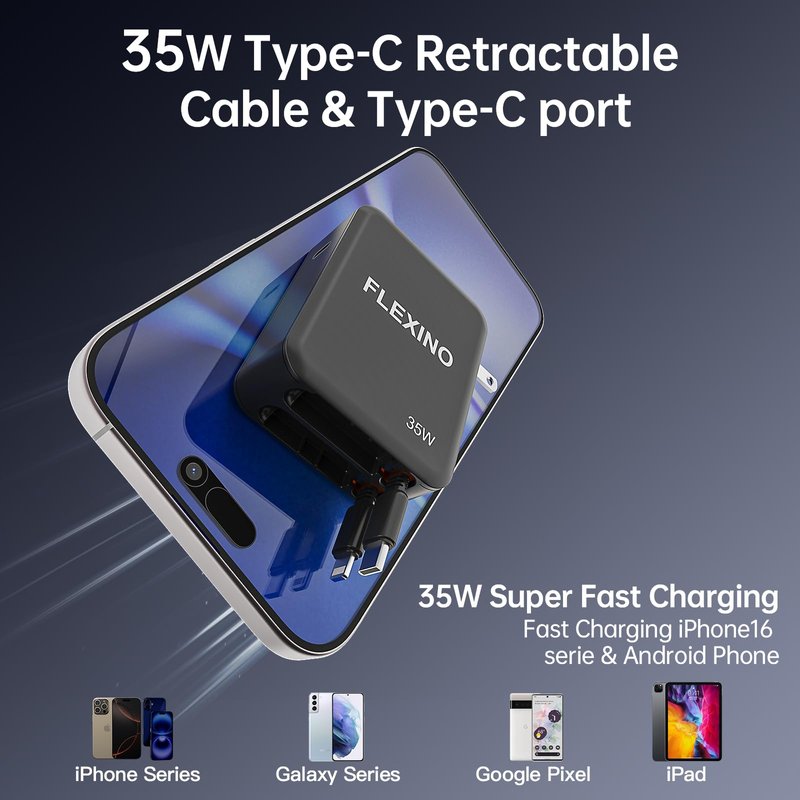 - Wide Compatibility for Multiple Devices: The FLEXINO retractable USB C charger is compatible with a range of devices including iPhone 16, iPhone 16 Pro Max, iPad, Samsung Galaxy, and Google Pixel. This versatile retractable phone charger is perfect for any tech setup, offering reliable charging across multiple brands