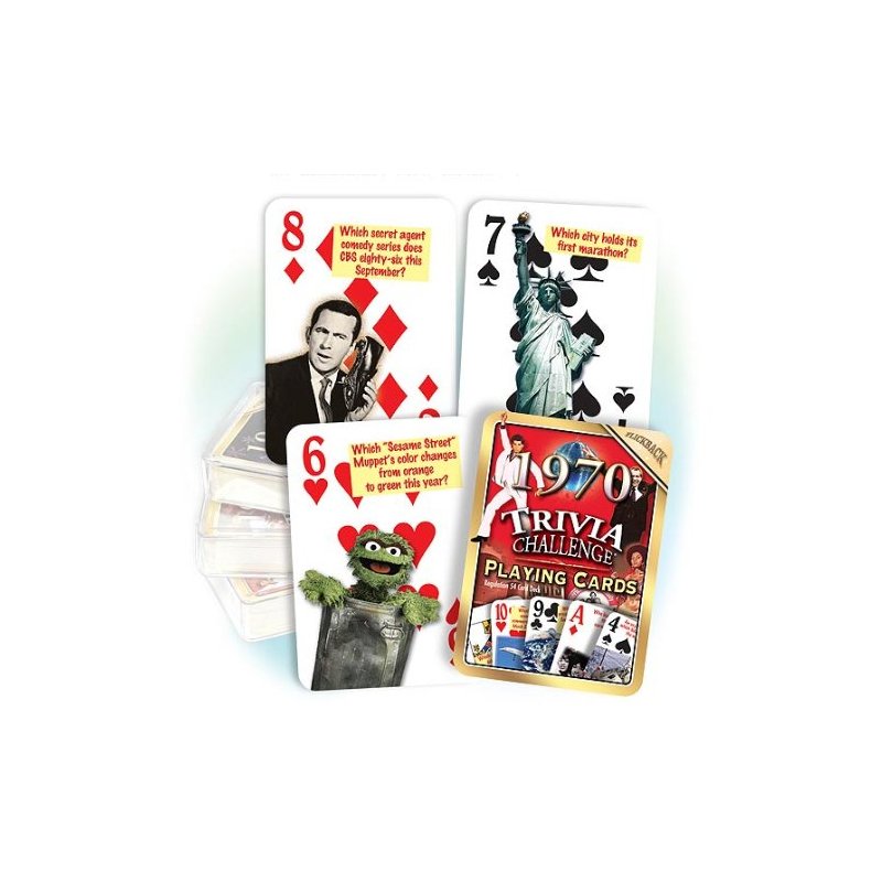 Do you know which spy genre comedy series CBS cancels? Or which Sesame Street muppet's color changes from orange to green this year? Test your knowledge or quiz your friends with these 52 colorful illustrated 1970-themed questions about the year's celebrities, sports, events, movies and music. A Key Card is provided with all the answers, as well as a pair of Jokers loaded with fascinating sports stats. Plus, the cards double as a regulation playing card deck!