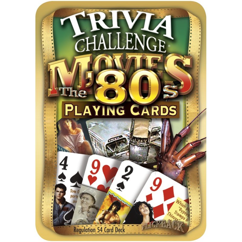 Think you know movies? Test yourself, family and friends by taking the 1980's Movies Trivia Challenge! Two decks in one: a trivia deck with different movie-themed questions, and a regulation playing card deck complete with two jokers. The 52 different illustrated questions in each deck range from easy to challenging, and each question is specific to the 1980's. Included with the deck is a key card to provide the answers.