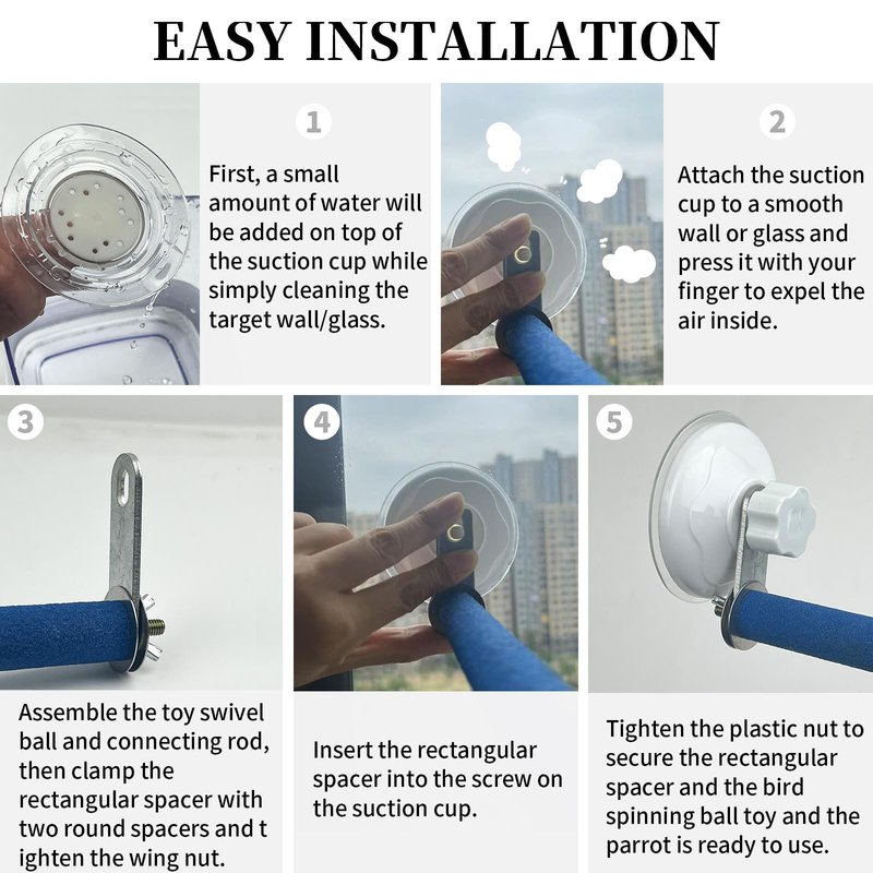 - Easy Installation: Wipe the suction cup with wet water and fix it on a clean and dry smooth surface, then use the pressure piece to connect with the bird perch toy, use the fixing knob on the upper end and the butterfly shaped screw on the lower end. Suitable for mirrors, flat tiles, glass windows, metal panels, UV/PVC transparent boards, baked boards, flat marble and other surfaces.