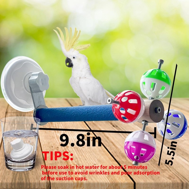 - Relieves Cage Life Boredom: A boring and gray cage life can easily make your parrot cranky and depressed and in a poor mood. This bird perch stand toy suction cup provides a timely platform for your parrot to enjoy the sunlight, while shaking the bell ball with their beak or putting some of your bird's favorite snacks, it's even a great puzzle foraging toy.