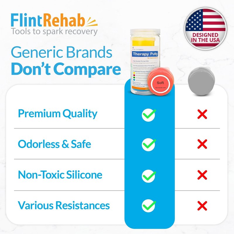 FlintRehab therapy putty contains four variable resistance putty for hand rehab. Each putty container includes three (3) ounces of putty that is silicone-based, non-toxic, and unscented.