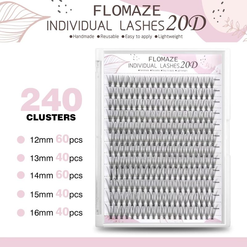 FLOMAZE 20D Lash Clusters, Individual Lashes 240pcs Faux Mink Lash Clusters Natural Handmade Cluster Eyelash Extensions C Curl 0.07mm Thickness False Lashes (12/13/14/15/16mm)