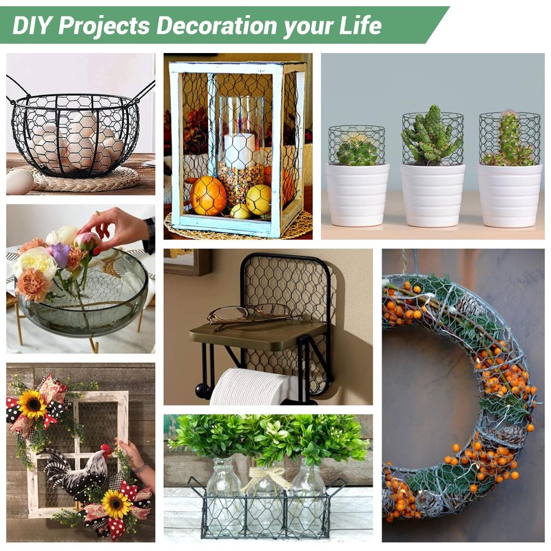- Craft for Floral Wire Fence: This galvanized wire mesh can create many home crafts that are sturdy and pliable, which allows you to DIY your home projects, like the safe cover of pet cages, Christmas wreath frames, cabinet door replacement, earring holders, photo walls, DIY floral decor, jar covers, etc. Unleash your creativity. You can cut and shape for any other small project.