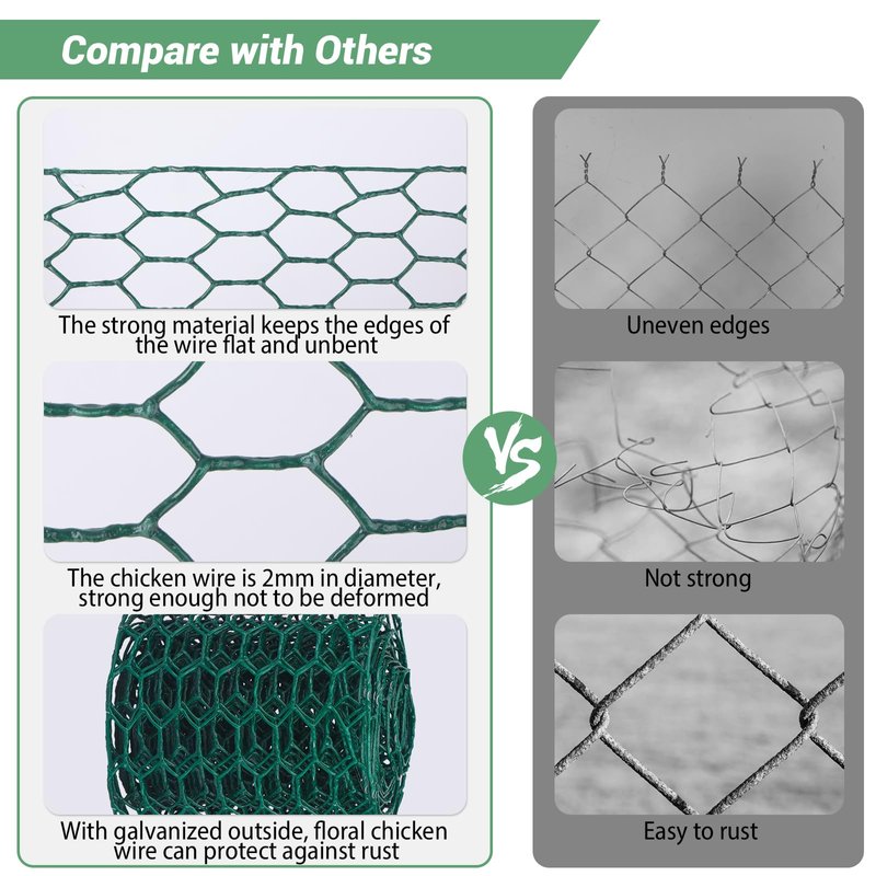 - High-Quality Material: Our chicken wire fencing is made of high-quality galvanized iron with a wire thickness of 2mm. The iron green chicken wire can against rust and corrosion protection. The galvanized wire mesh roll is soft and flexible, bendable and cuttable, and lightweight but stronger than nylon or plastic mesh netting, which makes your outdoor projects stronger and longer.