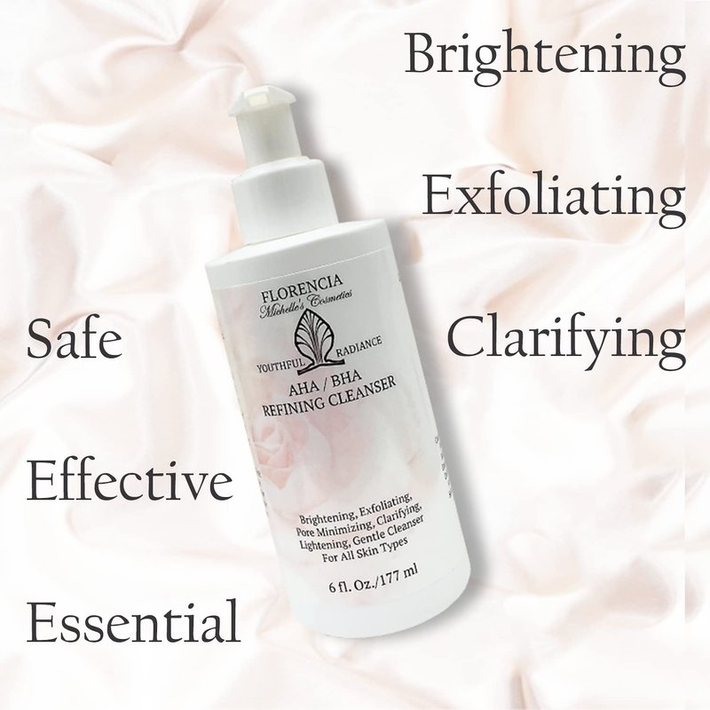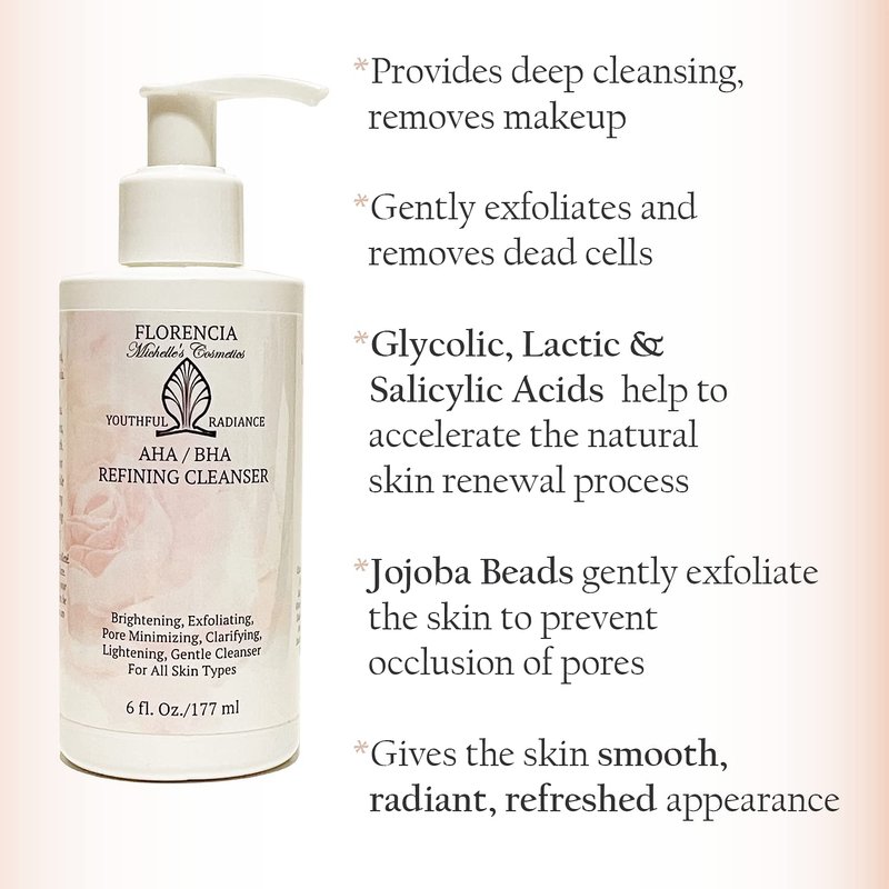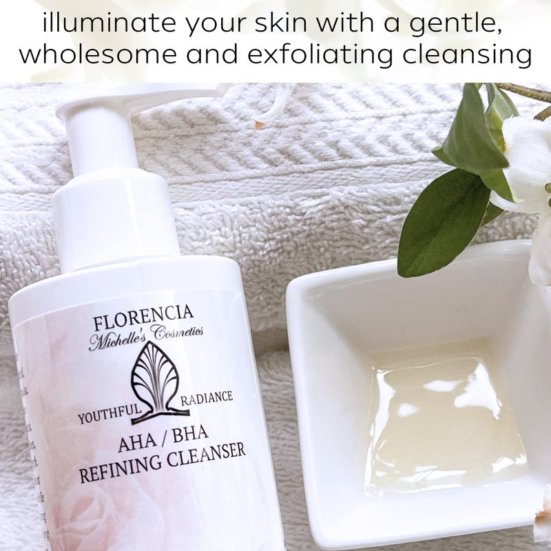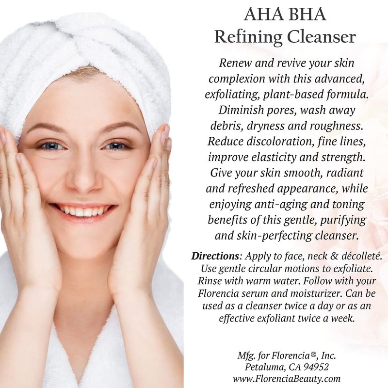 Florencia AHA BHA cleanser deep cleanses, revitalizes, rejuvenates, and revives healthy radiance by gently exfoliating and revealing younger-looking skin. Packed with natural ingredients, our natural face wash refines, refreshes and renews the skin for a youthful radiant glow. Jojoba beads, Glycolic Acid, Lactic Acid, and Salicylic Acid remove dead cells and other impurities, unclog the pores, diminish fine lines and illuminate your skin, helping to reduce acne marks and discoloration. Our exfoliating face wash encourages cell turnover and stimulates skin renewal, helps to promote elasticity and function of the skin as a strong, healthy barrier.
