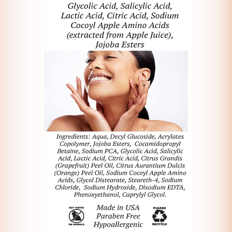 - NATURAL & CLEAN INGREDIENTS: Proudly made in the US, our aha/bha exfoliating face cleanser includes carefully selected, natural, filler-free, non-GMO ingredients to refine & renew skin for a youthful radiant glow. Our cruelty-free skincare products are manufactured in a GMP compliant facility.