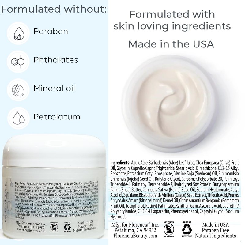 - SKIN LOVING INGREDIENTS, FREE OF HARSH CHEMICALS: Our paraben-free, hypoallergenic collagen face cream is proudly Made in the USA with a stringent manufacturing process. Our ultra peptide gentle moisturizing face cream made without GMO, Gluten, Parabens, Petroleum, Phthalates, Silicones, Sulfates, Fragrance Free and Cruelty Free for a guilt free use.