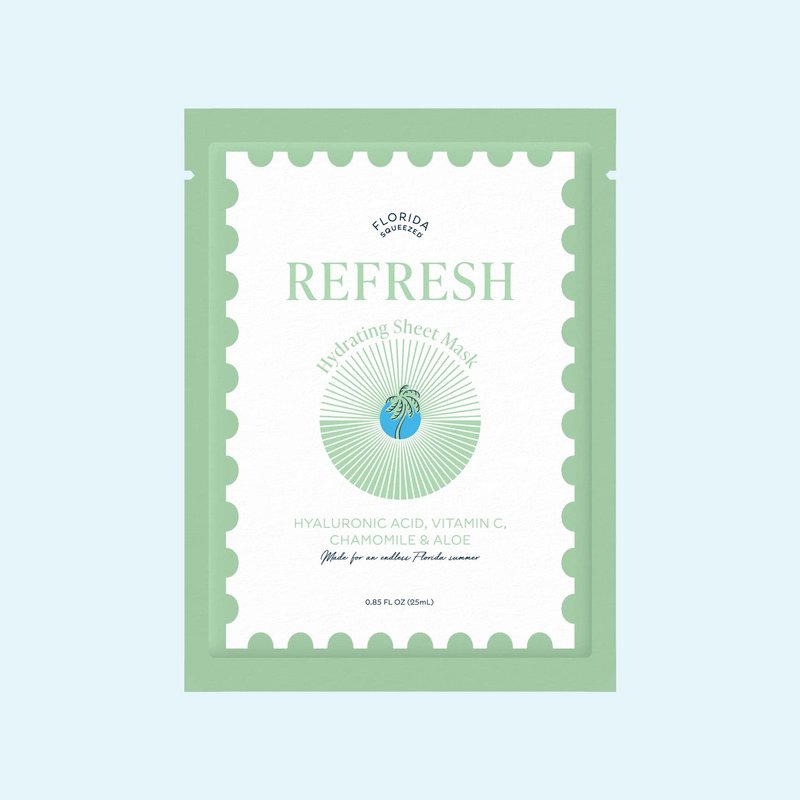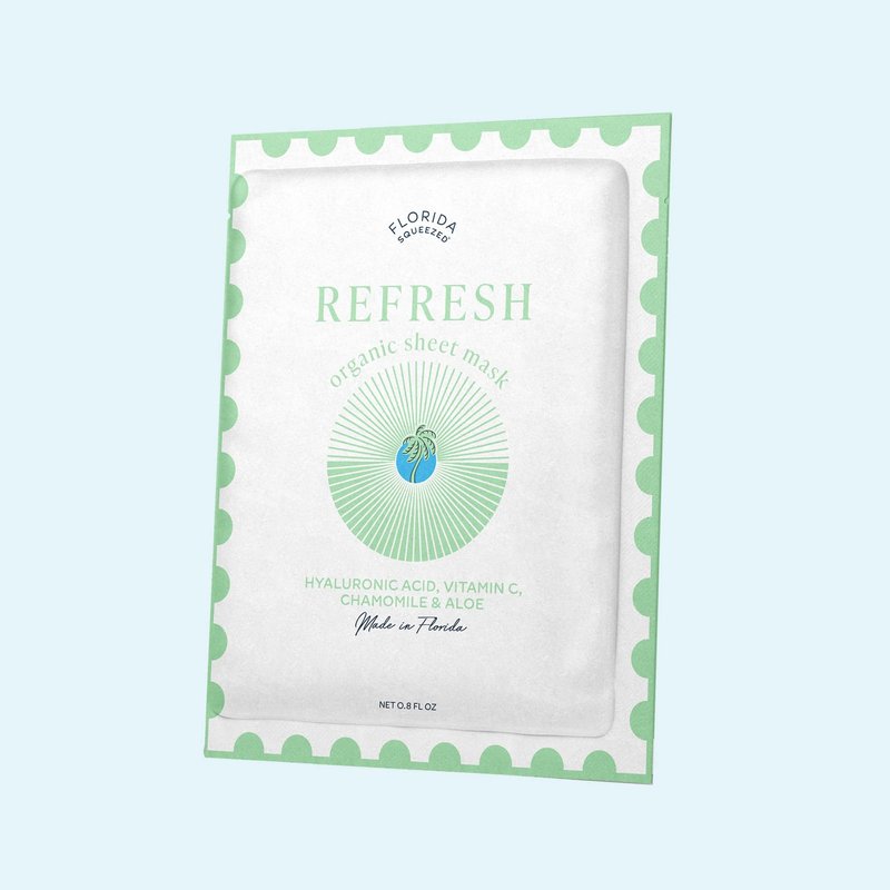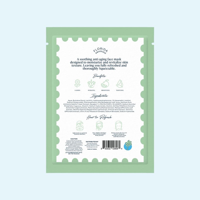 Introducing the Florida Squeezed Refresh Hydrating Sheet Mask - the perfect pick-me-up for your skin! Infused with the power of hyaluronic acid, vitamin C, roman chamomile, and aloe, this sheet mask will leave your skin feeling refreshed, rejuvenated, and ready to take on the world.