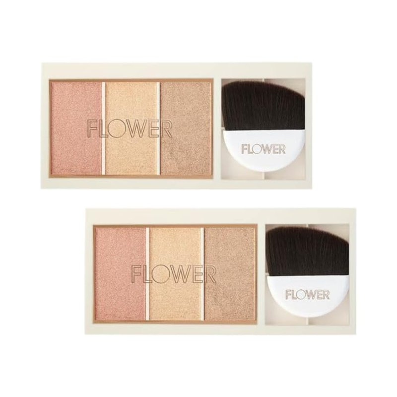 FLOWER Beauty Shimmer & Strobe Highlighting Palette | Glowing Bronzer Powder Kit For Face | Blendable Coverage | Skintones | 3 Enhancing Colors | Strobe Brush Included - Sunkissed Shimmer (Pack of 2)