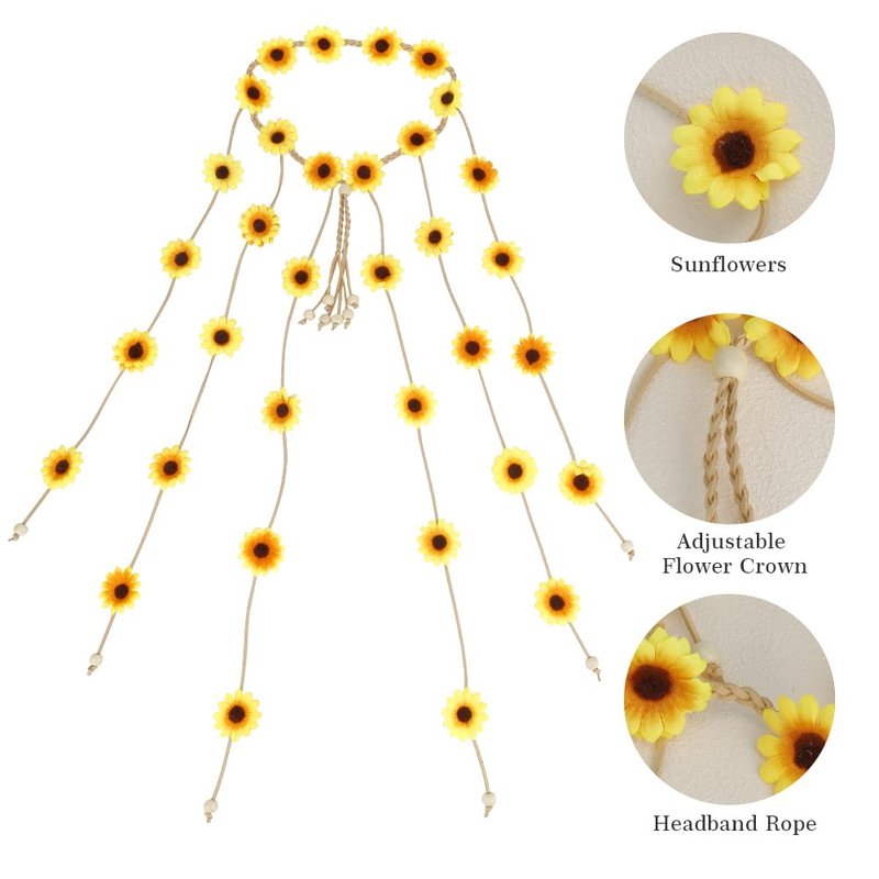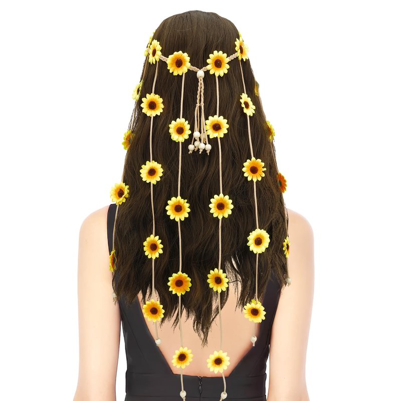 - HIGHTLY QUALITY: Hippie headbands for women 70s, is handmade soft material, exquisitely crafted, made of lots of sunflowers, braided rope and white wooden hippie beads. Hippie flower crown is lightweight and carefully handmade, hippie headbands are very versatile, can be used boho accessories for women to decorate your hair, tied around your waist or as a necklace, also can be tied to your hat and hair to make the sunflowers fall down your back like a waterfall.