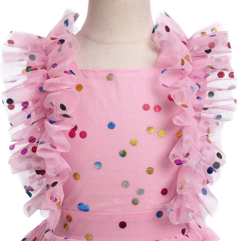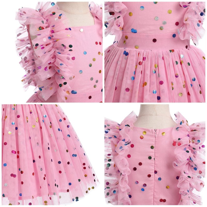 - ❤❤【Rainbow Polka Dots Flower Girls Christening Dress as Best Gift】Princess pageant sequin butterfly tulle dresses for girls, embellished with glittering sequins colorful dots and vintage floral lace butterfly at hem. Sleeveless ruffled shoulder straps and square neck summer tutu dress, printed with colorful polka dots pattern, stylish and eye-catching. Great to pair with glitter sequins bowknot headband headwear for little girls baby shower gift, princess birthday gift, christening baptism gift.