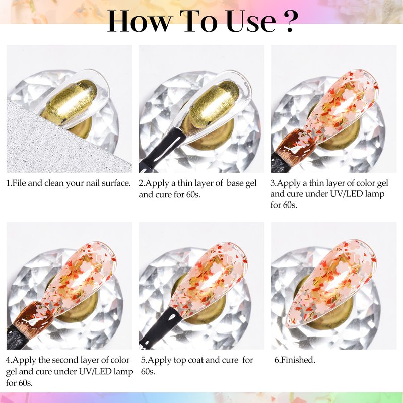 - NEED CURING WITH UV LED NAIL LAMP: The flower sequins gel nail polish kit need to be cured under UV LED light. Base and Top coat required. Average for LED light 30-60 secs, UV light 90-120 secs.