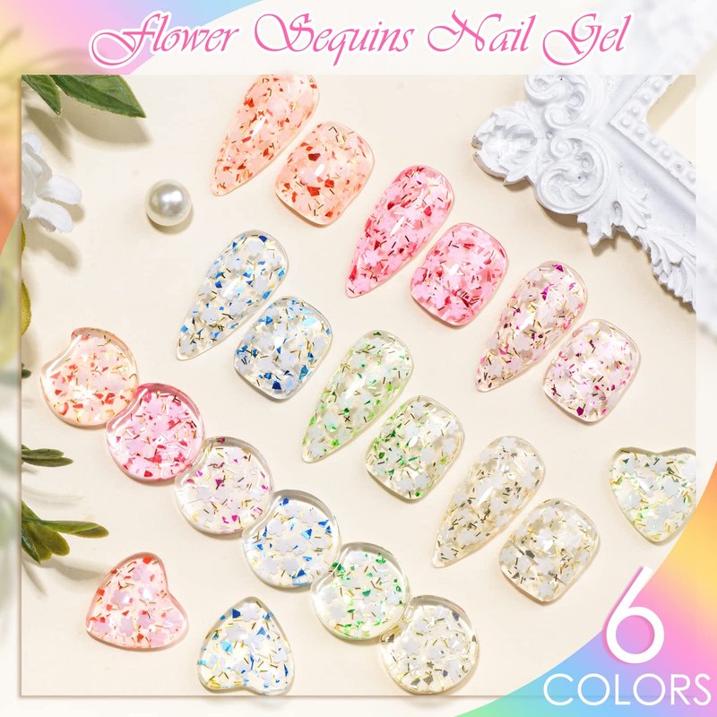 - PACKAGE CONTENTS: 6 Bottles 5ml flower gel with painting brush.This gorgeous flower gel nail polish set is suitable for every nail lover. flower and sequins which make your nails look like special and spring come after applying, and it is especially suitable for dates, parties, or ceremonies.