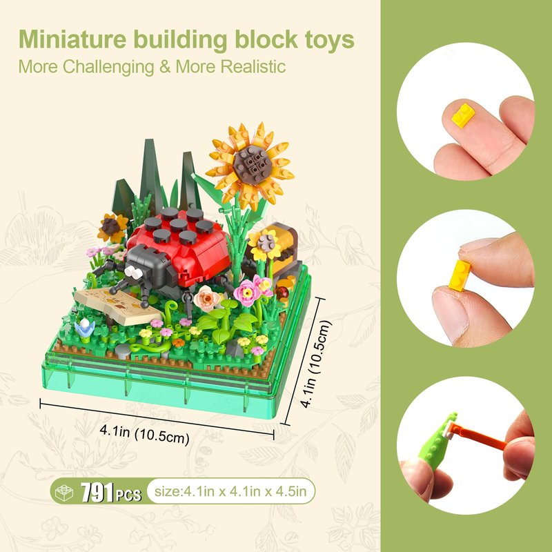 - Mini ladybug flower Building Blocks toy consisting of 791 uniquely shaped building blocks, and comes with a display box and base, it is perfect for children aged 6+ or adults. Makes a surprise gift for building toy lovers.