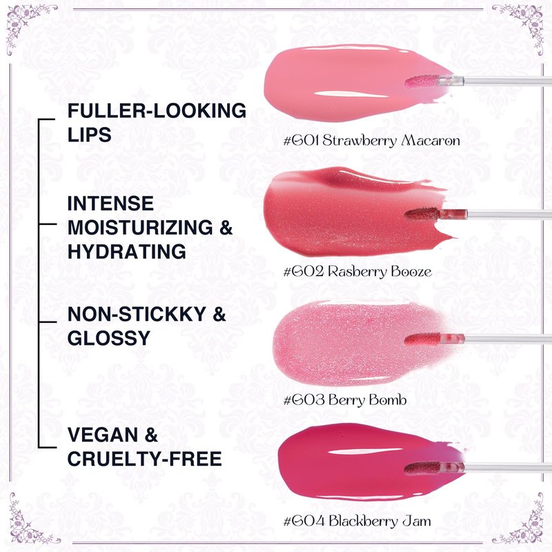 - Perfect Pout Lip Products:Choose from four stunning shades,ranging from sheer pink to vibrant plum.Our versatile lip gloss can be worn alone for a boost of moisture and shine or layered over your favorite lipstick for a bold,colorful statement