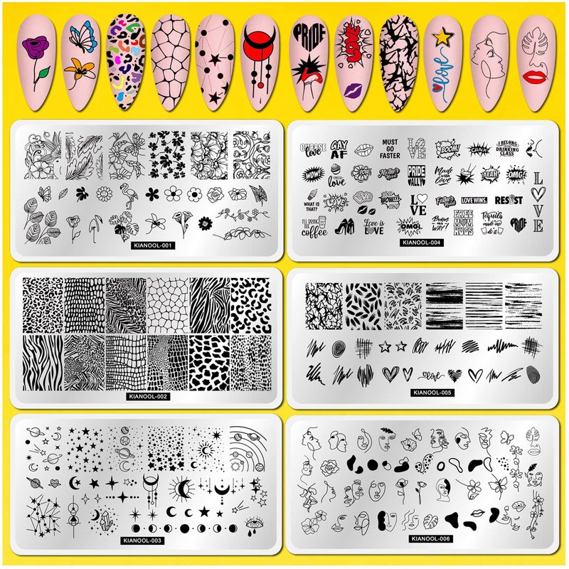 - *FUN DESIGNS* our stamping plates size 12x6cm /4.7x2.4inch, the right for everyone's nails, nail printing plate designed with line, flowers, leaf, animal, leopard print, heart, stripe, space, star, letter, abstract human face, etc. rich cute designs make your nail look unique, fashionable