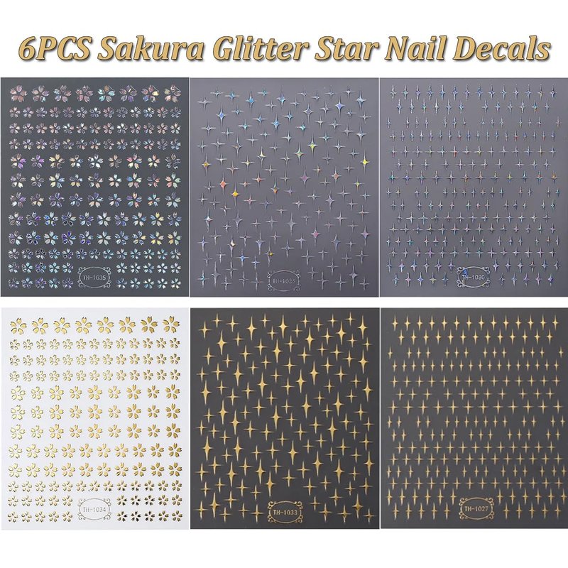 3D Laser Flower Nail Sticker Star Decals Sliver Gold Star Floral Adhesive Sliders Cherry Blooming Manicure Accessories Specification: Item: Sakura flower star 3d nail art sticker Color: As the picture Effect: Spring flower 3d self-adhesive nail designs Type: 3D self-adhesive transfer sliders for nails Design: Gold silver cherry blossom, star, flower Package: 6pcs 3D flower star nail stickers Usage: Japanese Style Manicure Nail Art Decorations Wedding Nail Art Daily Nail Art Design Features: 1. Cute designs of flowers, dreamcatcher. 2. Easy to apply on natural or artificial nails. 3. Suitable for professional salon or home use. 4. Easy removing, change the pattern any time. 5. Great for nail polish, UV gel, artificial & acrylic nails, etc. 6. Elegant and fashionable style, easy to match any nail color. Usage Steps: 1. Clean up your nail surface. 2. Paint your nail polish until it is dry. 3. Use tweezers to peel off the pattern softly from the base paper. 4. Stick the pattern on the nail and press the pattern for a few seconds. 5. Cover the butterfly nail decals with transparent nail polish.
