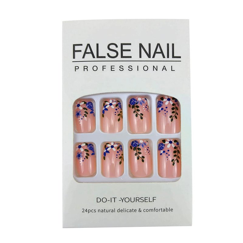 Blue Flower Press on Nail Summer Fake Nail Short Sqaure Full Cover False Nail Sticker on Nail for Women Girls Glue on Nail