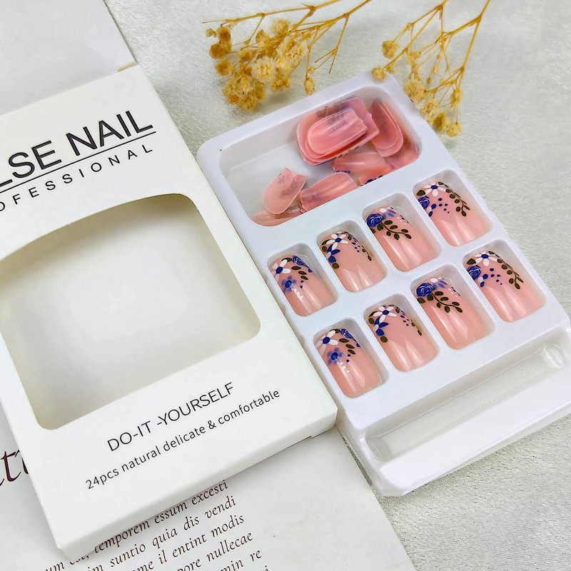 - 🧡 Flower Fake Nail : 24pcs blue Flower press on nail .The blue color on these nail art stickers is eye-catching and adds a pop of color to your nails. It is a versatile shade that goes well with a variety of outfit styles and occasions.