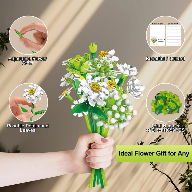 - 【7 Types of Bouquet Building Toys】The flower craft set includes a variety of flowers, from the timeless elegance of daffodils, the sweet fragrance of jasmine, the cheerful charm of daisies, the unique beauty of Astrantia, the bright colors of Viburnum, the sunny breath of camellias, to the festive atmosphere of Eustoma, these flowers can enhance the quality of any decoration. Each artificial flower bouquet has its unique style, making your arrangement stunning and imaginative.