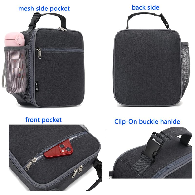 Product Features: Color: Dark Size: W:3.9 x L:8.5 x H:9.8 inches, Rectangle Material: durable 600D Polyester,food safe PEVA lining and Sturdy zippers Zippered Front Pocket and inner mesh pouch: A zippered front pocket for hiding a surprise dessert or fun note,a handy inner mesh pouch perfect for napkins and utensils,you could secure water bottles or ice pack inside the lunch pail. Soft handle: heavy duty handle for hand carry Premium fabric construction: make this compact,lightweight lunch bag durable and easy to clean.Insulation helps retain hot and cold temperature whole day to improve food quality, freshness and taste.Also it can keep the meal healthy. Product Description: The FlowFly reusable lunch bag has helped millions of families take safe, healthy meals everywhere. The roomy,spacious,insulated interior and premium fabric construction will make sure you have a nice meal, this portable lunch pail could be used for children,adult, men, women for light meal and drink,it suit for work, school, beach, travel, picnic, hiking.The adorable lunch kit is moisture resistant,quick and simple organization,perfect for Age 3+ and on the go parents.