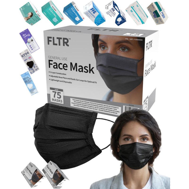FLTR General Use Face Mask, Black, 75 Count 75 Count (Pack of 1)