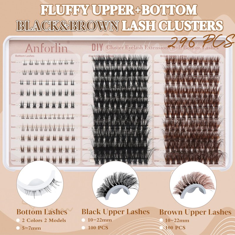 Fluffy Lash Clusters 10-22mm 80D with Bottom Lashes 5-7mm Black Lashes & Brown Lash Clusters D Curl Cluster Eyelash Extensions 296 PCS Thick Volume Individual False Eyelashes DIY At Home, by Anforlin