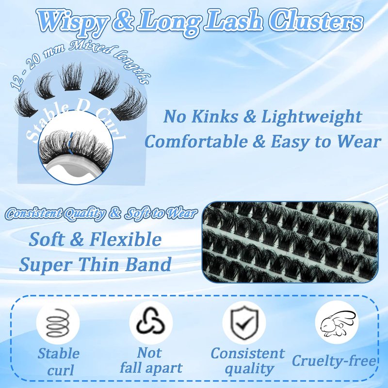 - 【Fluffy & Wispy Trendy Eyewear】: Unlike cluster lashes with varying densities, these refined, high-quality lashes offer a fresh look. Our fluffy lashes deliver a mega volume effect with the perfect blend of curl and thickness, creating a lightweight yet striking, captivating look.