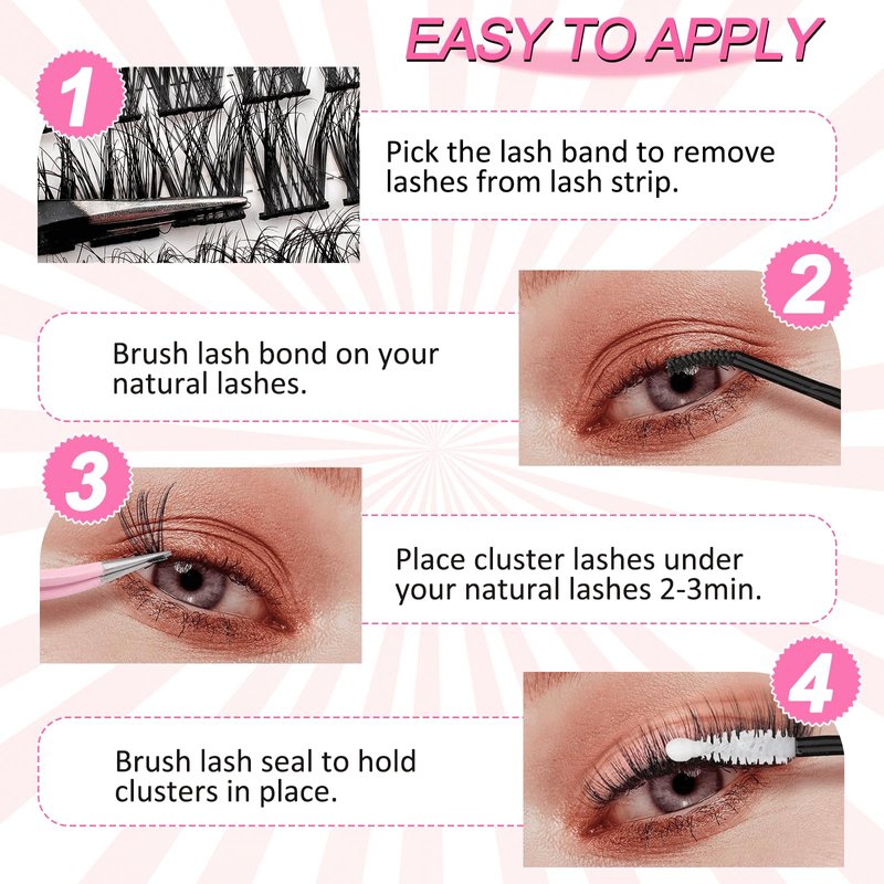 - Easy To Use and Perfect Long Lasting: The eyelash adhesive in the kit is designed as a 2 in 1 eyelash adhesive and eyelash sealant.One side is an eyelash adhesive and the other side is an eyelash sealer. Making these clusters lashes easier to use and providing a longer-lasting hold.