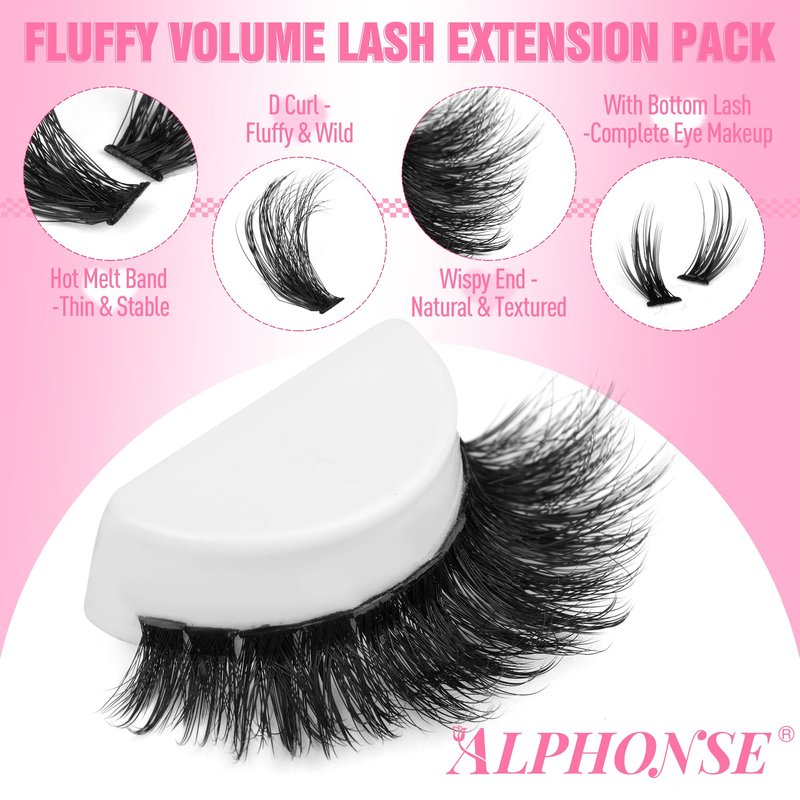 ALPHONSE Fluffy Eyelash Extension Collection, presenting an exquisite blend of 12-20mm lengths paired with 150D+200D volume lash clusters and 5-7mm bottom lash clusters, expertly tailored to enhance your unique beauty. This collection boasts soft, voluminous wisps and impeccably slender bands, ensuring a wild appearance. Elevate your lashes to new heights of luxury and allure with ALPHONSE Fluffy lash clusters with bottom lashes.