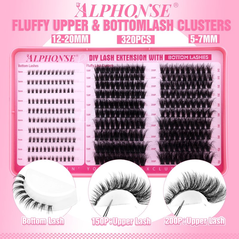 Fluffy Lash Clusters with Bottom Lashes Cluster Eyelash Extensions Thick Volume Individual Lashes 320pcs ALPHONSE Lash Extension Clusters for Beginners (150D+200D, 12-20mm)